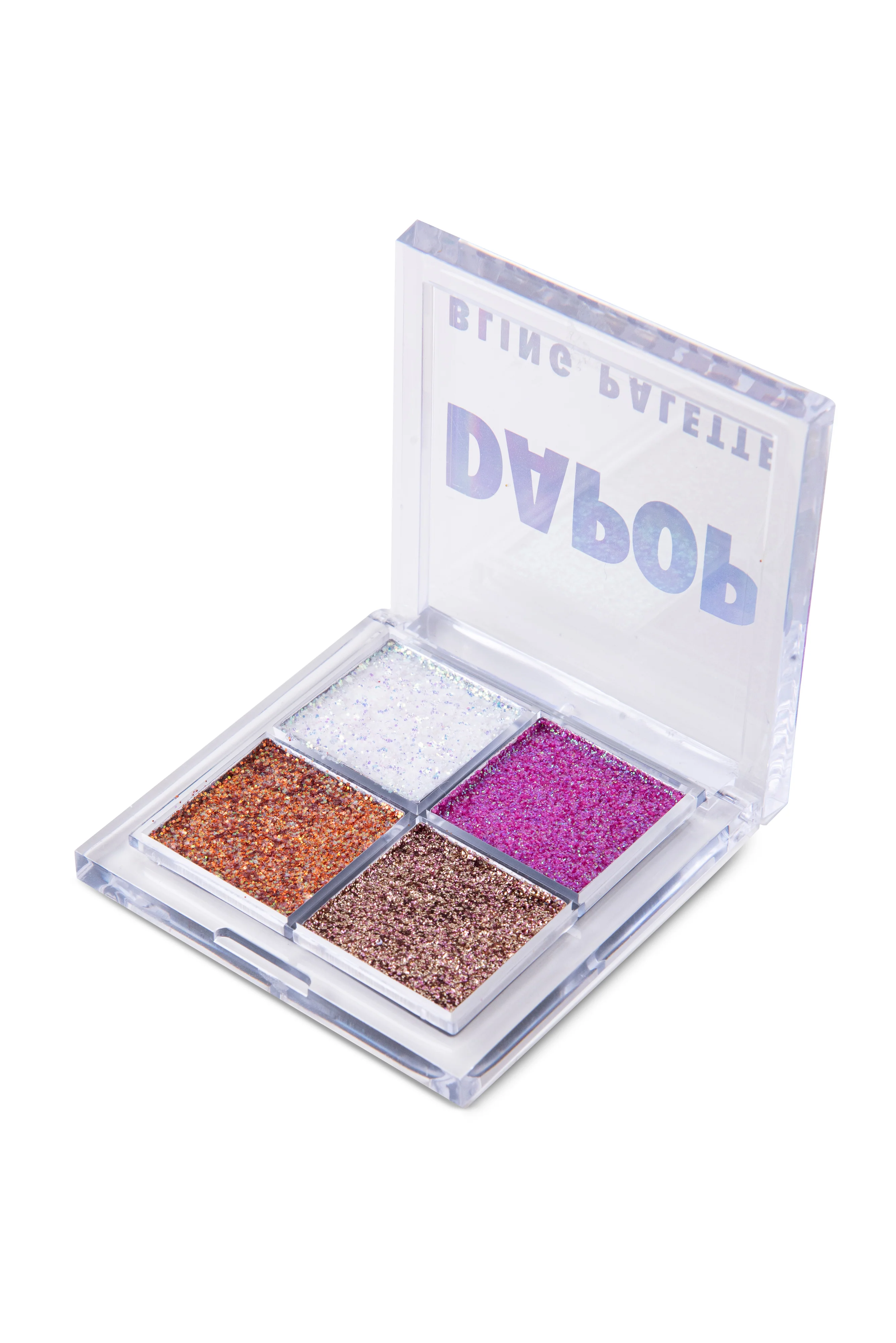 Paleta con cuatro glitter prensados de alta pigmentación y excelente fijación.